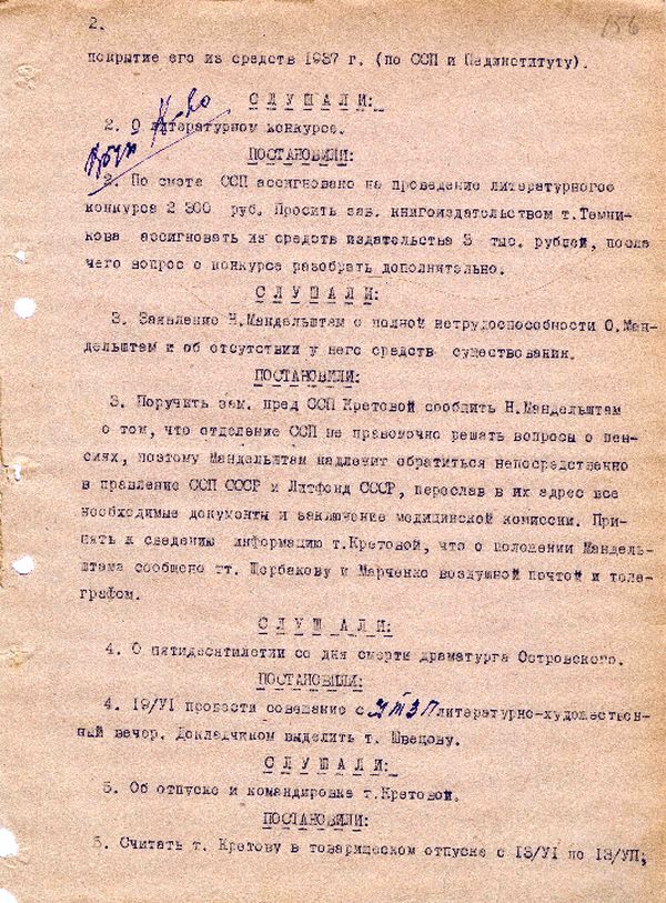 | Постановление Секретариата Союза писателей СССР от 7.1.1938. |