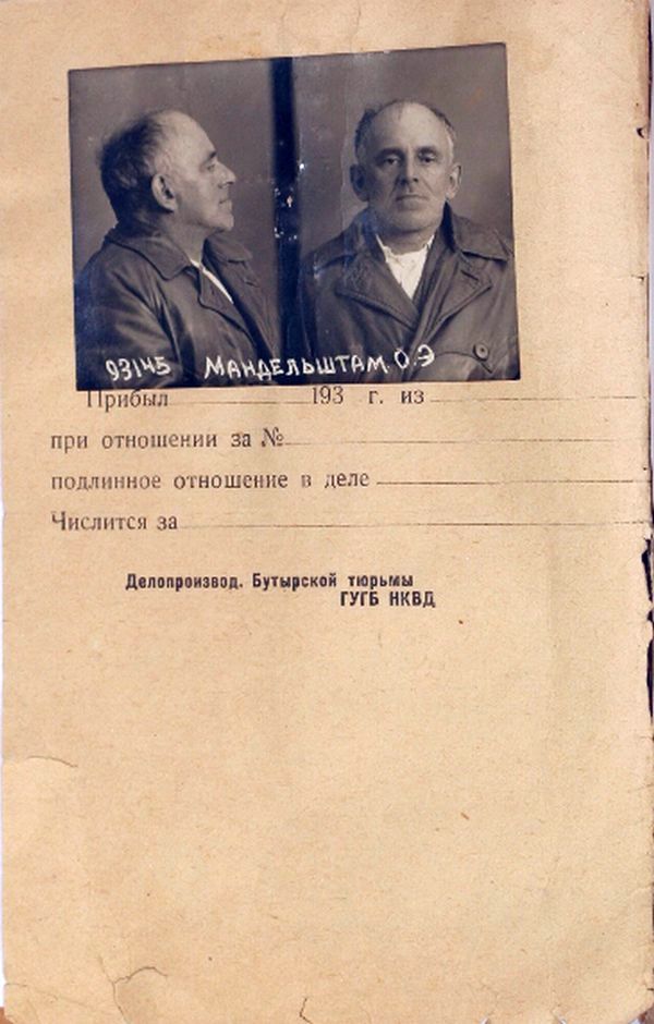 | Подлинная обложка дела О.Э.Мандельштама и его тюремная фотография, 1938 г. |