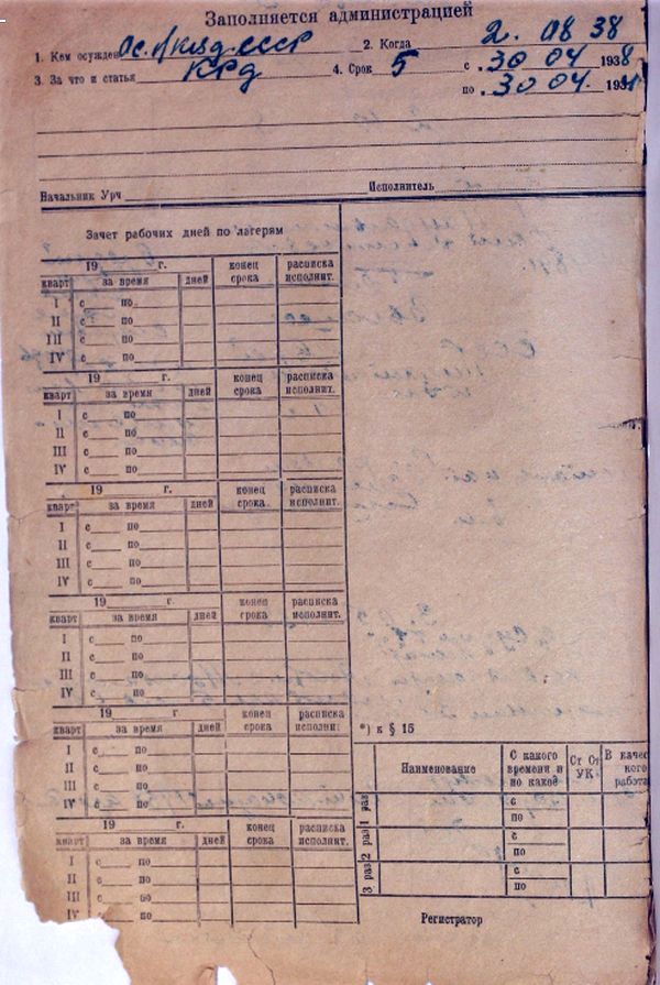 | Учетно-Статистическая картотека. Личное дело О.Э.Мандельштама № 117794, 12.10.1938 г. |