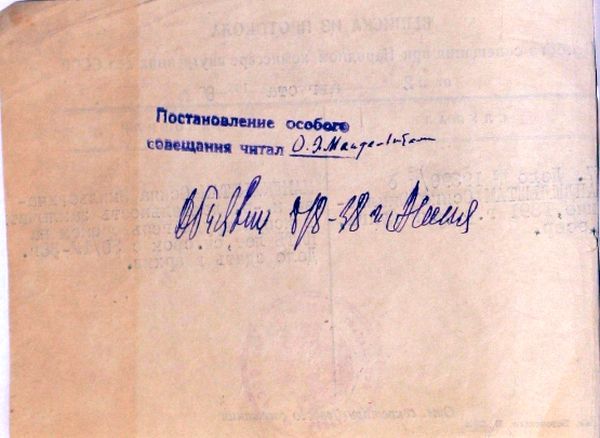 | Выписка из протокола ОСО при НКВД СССР от 8 августа 1938 года. |