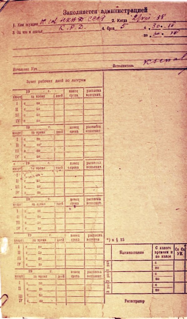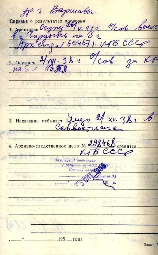 ЦА ФСБ РФ. Ф. Р-33487. Оборот обложки. Рукописный текст на типографском бланке-анкете. Автограф С.Вепринцева.