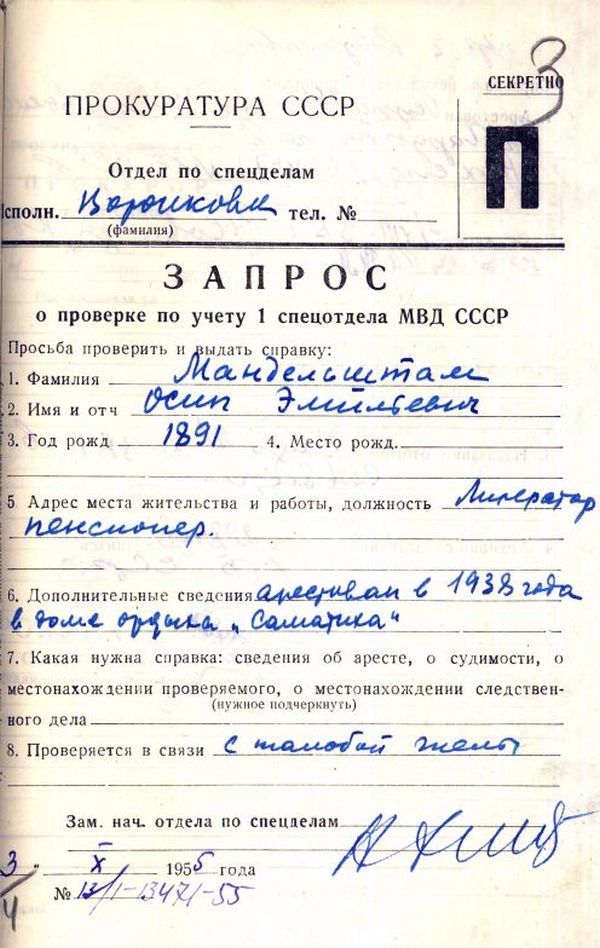 | Переписка по поводу данных об аресте и осуждении О.Э.Мандельштама. |