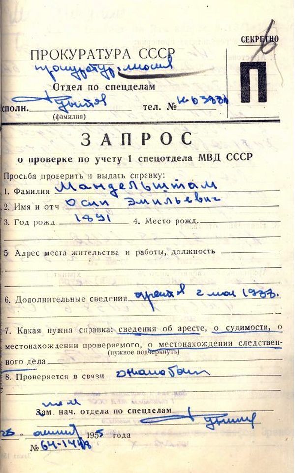 ЦА ФСБ РФ. Ф. Р-33487. Л. 3-3об. Форма №5, заполненная О. Э. Мандельштамом. Пометы следователя: «512/4 СПО» и «11.9. к-р. [нрзб] Шиваров». Штамп: «По Центральной картотеке У.С.О. О.Г.П.У. СВЕДЕНИЙ НЕТ. Нач. III отделения Подпись. Справку наводил Подпись. 17/V/1934 г».