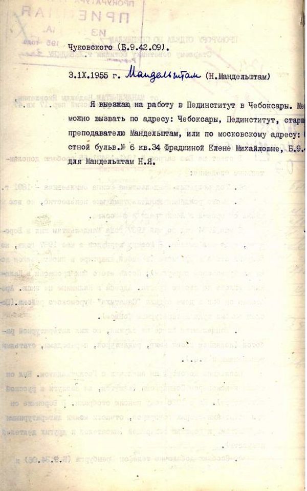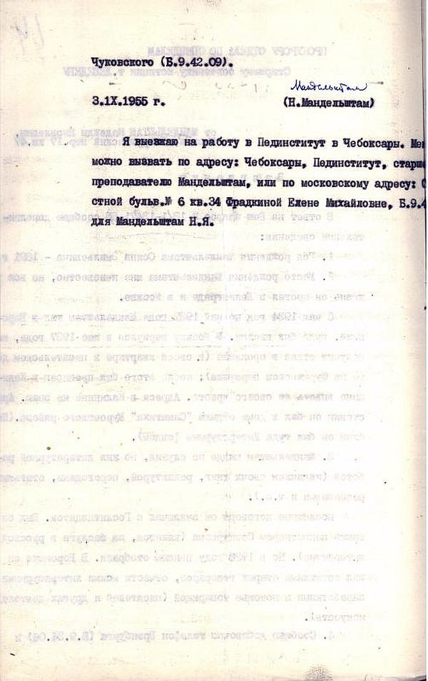 | Письмо Н.Я.Мандельштам прокурору Отдела по спецделам Прокуратуры СССР старшему советнику юстиции Лебедеву от 3 сентября 1955 г. |
