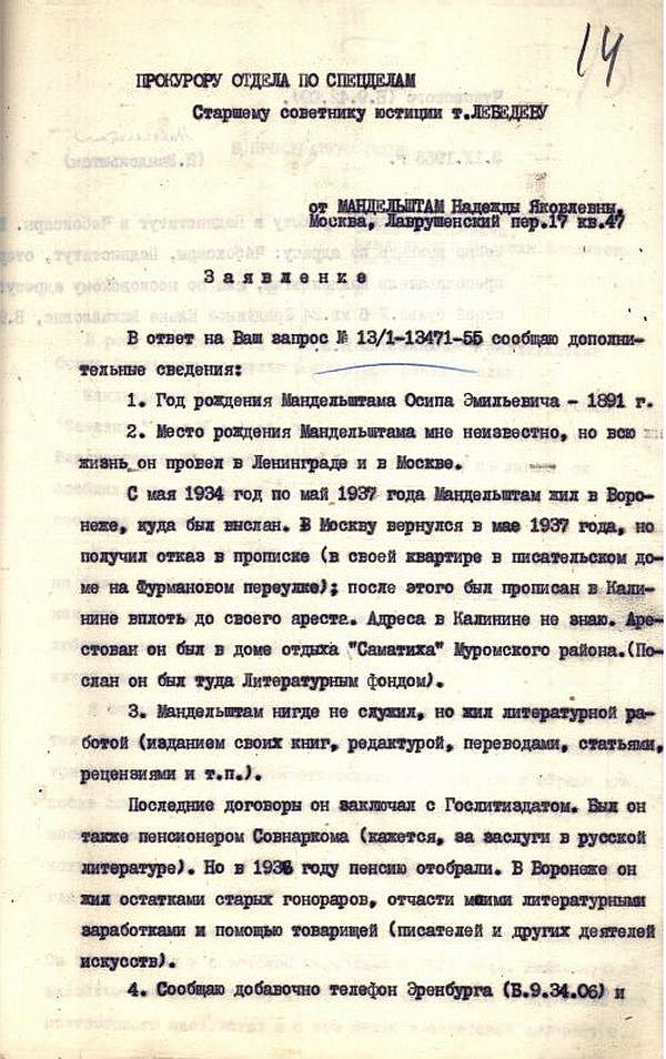 | Заявление Н.Я.Мандельштам от июня 1956 года в Прокуратуру СССР о пересмотре и посмертной реабилитации Мандельштама О.Э. по делу 1934 года. |