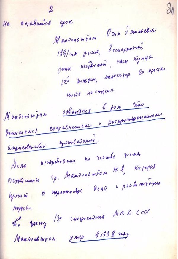 | Заявление Н.Я.Мандельштам от 21 мая 1956 года с запросом о состоянии дела о посмертной реабилитации О.Э.Мандельштама. |