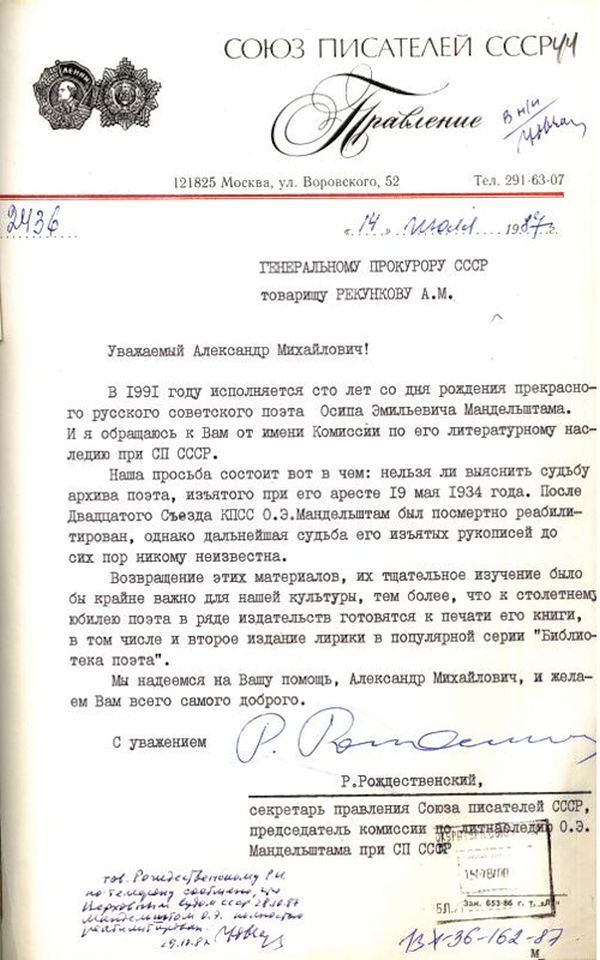 | Обращения Р.И.Рождественского от 11 марта и 14 июля 1987 года к Генеральному Прокурору СССР A.M. Рекункову. |