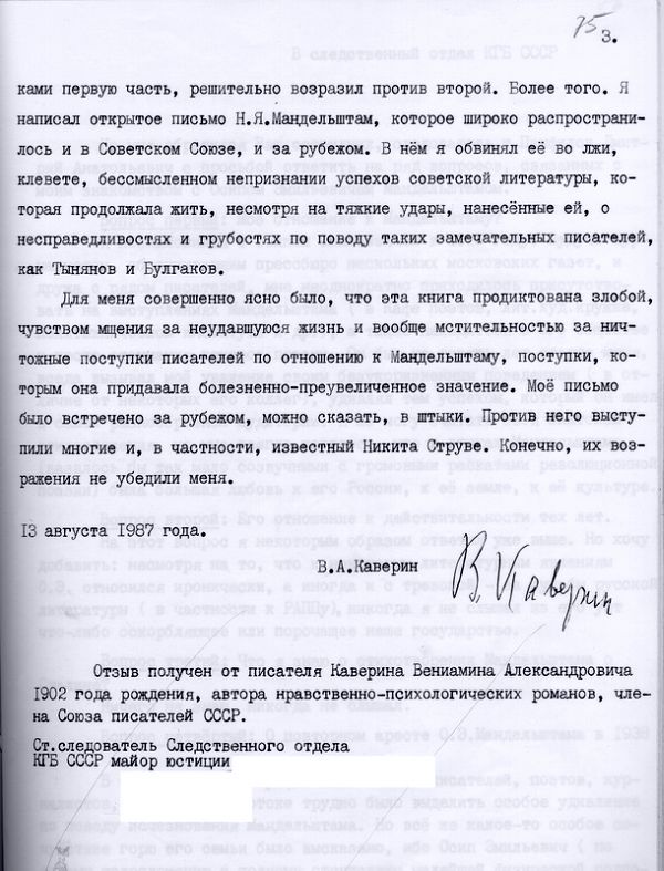 | Отзыв в Следственный отдел КГБ СССР В.А.Каверина от 13 августа 1987 года. |