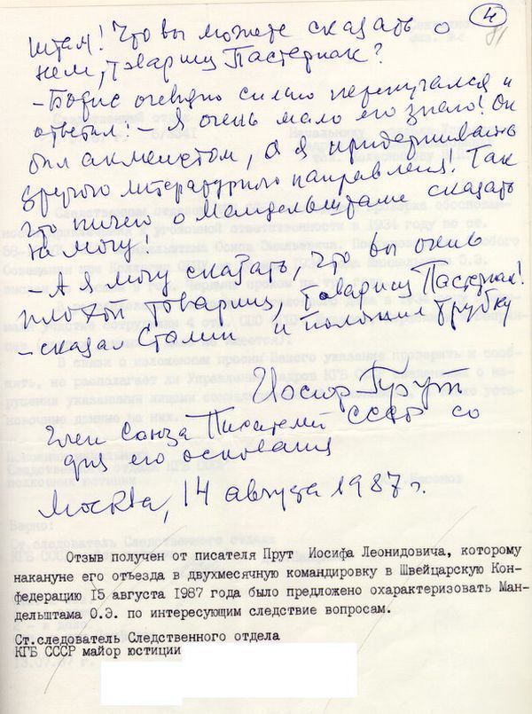 | Отзыв в Следственный отдел КГБ СССР И.Л.Прута от 14 августа 1987 года. |