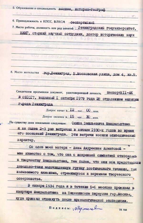| Протокол допроса свидетеля Л.Н.Гумилева от 26 августа 1987 года. |