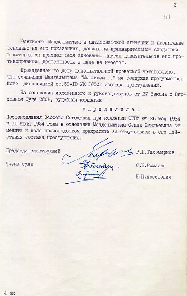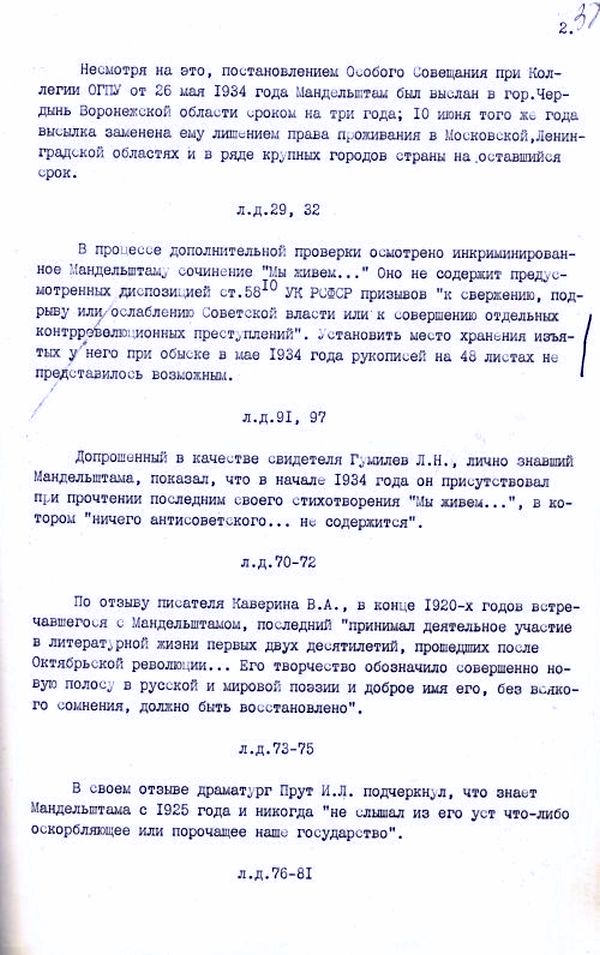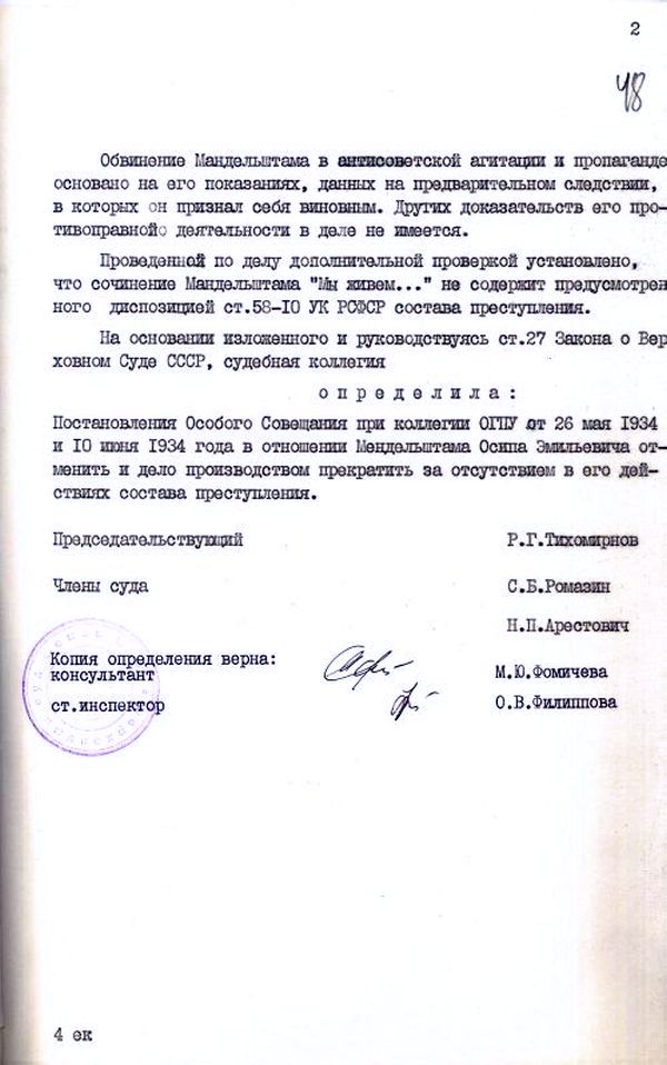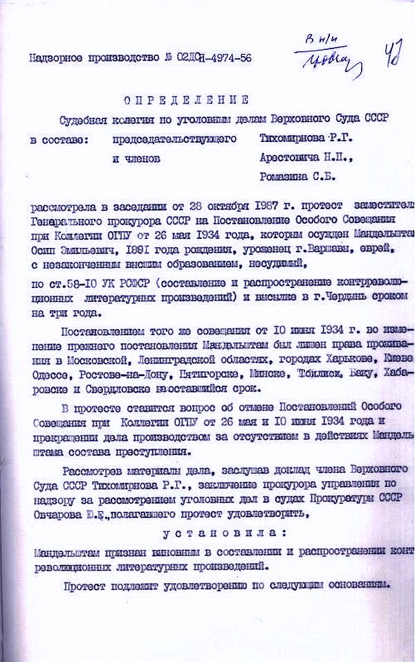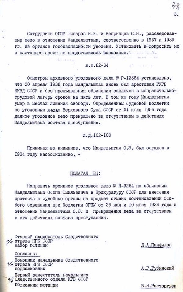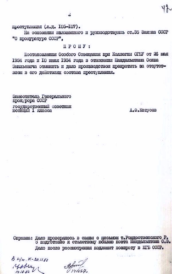 | Заключение прокурора отдела по надзору за следствием в органах государственной безопасности А. Федорова по делу О.Э.Мандельштама 1934 года от 24 октября 1956 г. |
