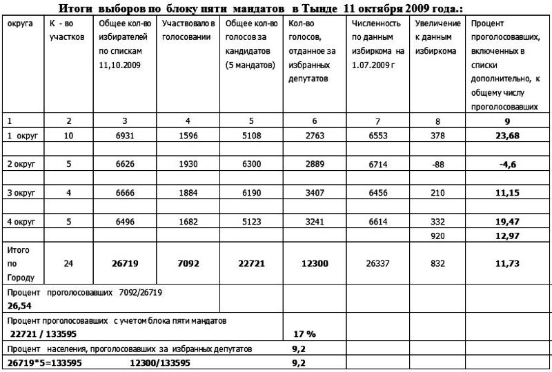 Просим вас принять меры по изложенным фактам противоречия законов Амурской области федеральным законам и Конституции РФ, а кроме этого, рассмотреть ситуацию, чтобы законодательно была установлена норма, чтобы в округе было мандатов не более фактически сложившихся, при предыдущих выбора, если в 2011 году - замещено мандатов менее двух, то нельзя устанавливать пять мандатов. Из представленной таблицы наглядно видно, что представительный орган из двадцати депутатов поддержало всего 9,2 процента населения г. Тынды . А вот отозвать - нужно ПЯТЬДЕСЯТ ПРОЦЕНТОВ.