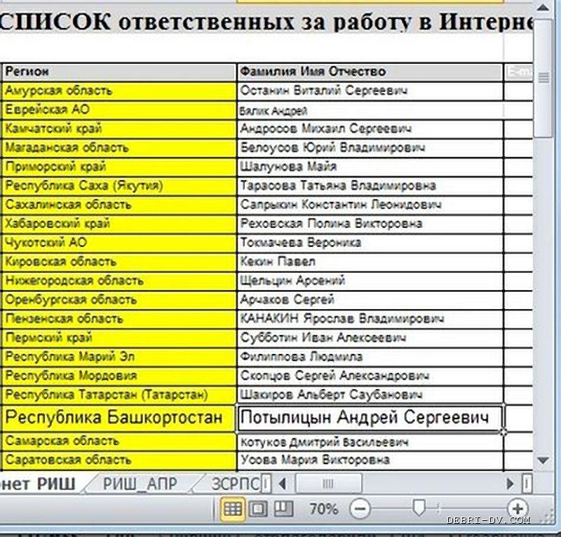 Если верить этому «Списку ответственных за работу в Интернете», то в Амурской области таким значится Виталий Останин, в Еврейской автономной области - Андрей Бялик, в Камчатском крае - Михаил Андросов, в Магаданской области - Юрий Белоусов, в Приморском крае - Майя Шалунова, в Республике Саха (Якутия) - Татьяна Тарасова, в Сахалинской области - Константин Сапрыкин, в Хабаровском крае - Полина Реховская, на Чукотке - Вероника Токмачева.