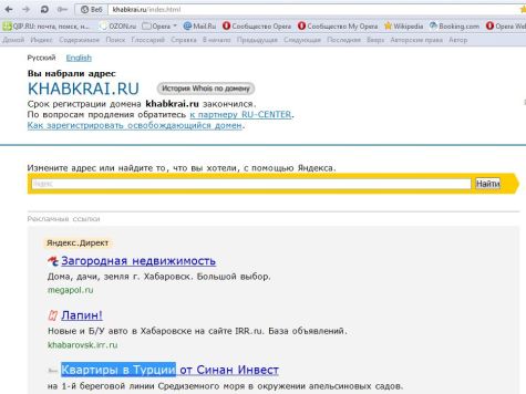 На сайте имелась надпись: «срок регистрации домена khabkrai.ru закончился. По вопросам продления обратитесь к партнеру RU-CENTER». И рядом предложение: «Как зарегистрировать освобождающийся домен». Также имеется информация, что домен оплачен до: 17.04.2013 г.