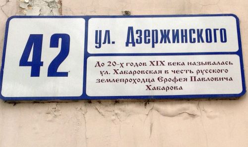 Так, пластиковая доска на доме №42 информирует население, что ул. Дзержинского ранее называлась ул. Хабаровской - в честь русского землепроходца Ерофея Павловича Хабарова. А теперь внимание: эта улица так называлась (цитирую): «до 20-х годов XIX века». До есть до 1820-х годов.
