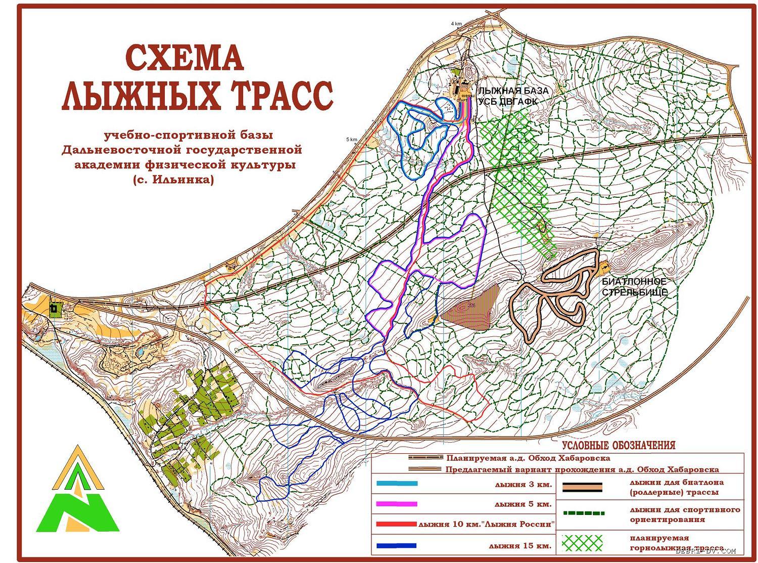 | Схема лыжных трасс ДВГАФК с планируемой автодорогой «Обход Хабаровска, 37-42 км» и предлагаемый спортивной общественностью вариант прохождения автодороги./ Нажмите, чтобы УВЕЛИЧИТЬ |
