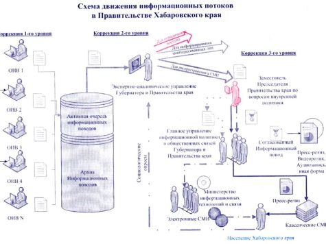 Далее алгоритм таков: согласованные информационные поводы передаются в главное управление информационной политики и общественных связей губернатора и правительства края для подготовки пресс-релизов. Последние передаются либо непосредственно в СМИ, либо в министерство информационных технологий и связи для распространения в электронных СМИ.