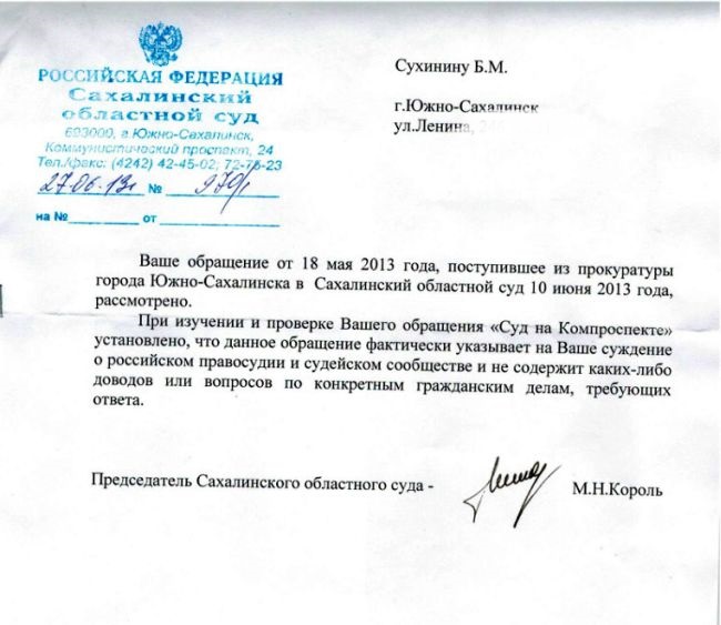 Что можно сказать в ответ на этот измышлизм господина Король М.Н.? Во-первых, ответ-то, какой никакой всё-таки был отписан и он, состоящий из двух предложений, конкретно подтвердил всю сущность судебной системы Сахалина, «замешенной на диктатуре закона». Но об этом ниже.