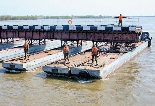 Всего для наведения наплавного моста привлечено около 100 военнослужащих бригады и 35 единиц автомобильной и специальной техники, передает управление пресс-службы и информации Министерства обороны РФ.