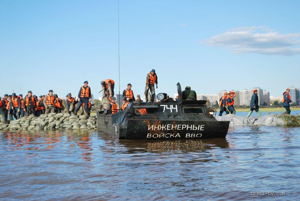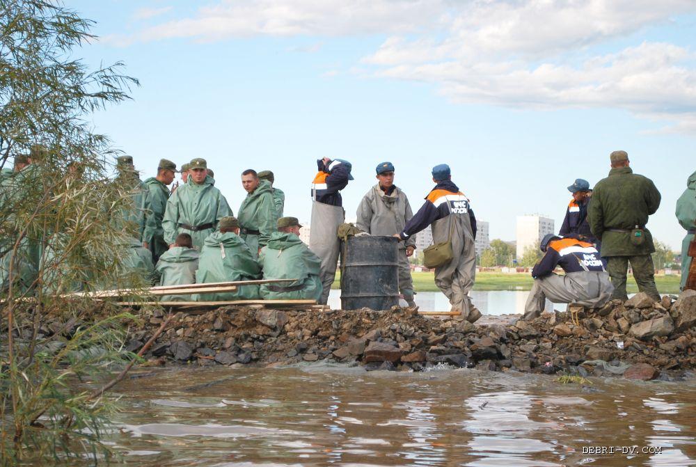 Продолжаются экстренные работы по отсыпке дамбы в пригородном поселке Новый Мир, который окружает вода по периметру длиною почти 5 километров. Совместно с местными жителями над спасением населенного пункта трудятся военнослужащие авиабазы, специалисты МЧС из Москвы и Твери. Подъем Амура завершился, но возможность прорыва дамбы силой волны остается. Между тем, специалисты уже вырабатывают план эффективного осушения пригородов индустриального центра ДФО.