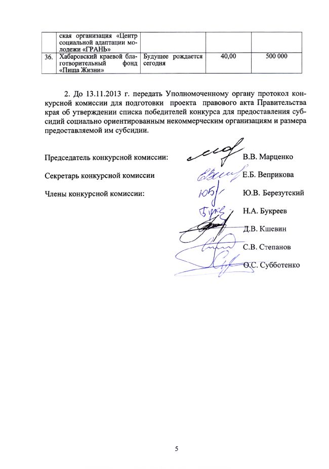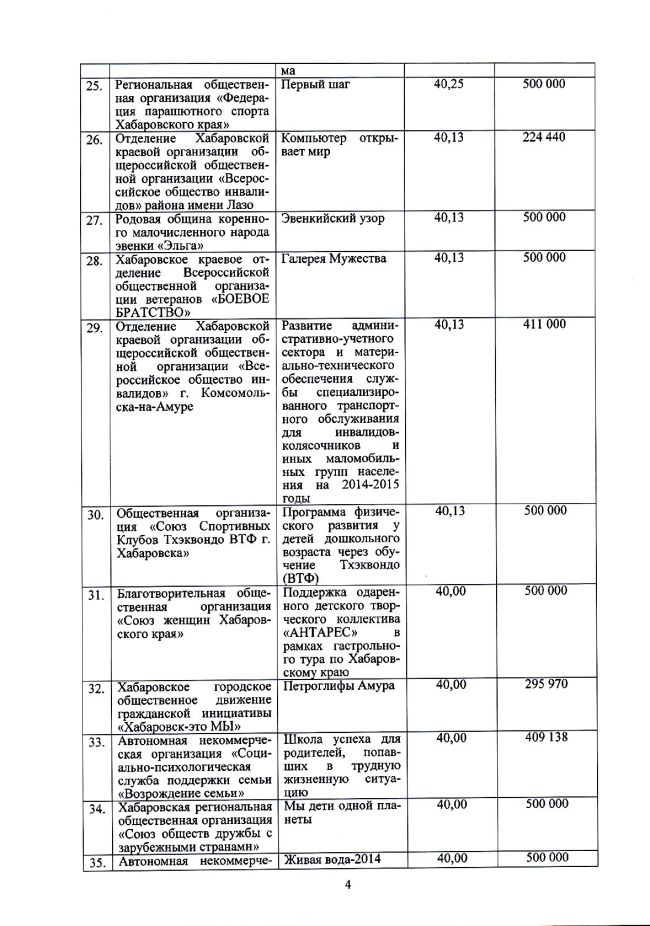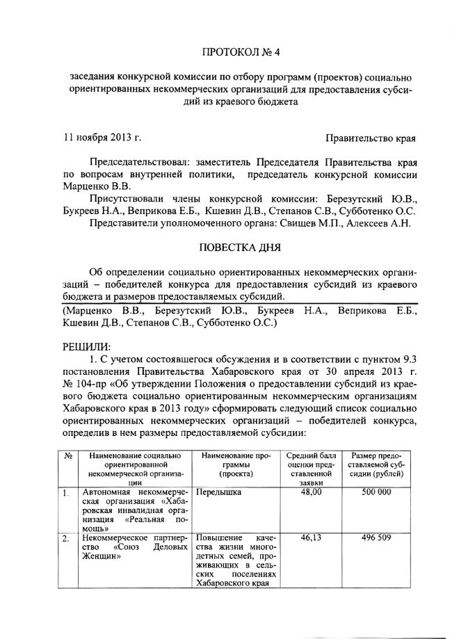 Среди заявителей, которых Виктор Марценко не допустил к участию в конкурсе, оказалось лишь три НКО: организация народов Севера Нанайского района; региональная благотворительная организация помощи неблагополучным слоям населения «Выбор» и федерация «Айкидо Кокоре додзе». Причина - отсутствие копий учредительных документов и выписок из ЕГРЮЛ.