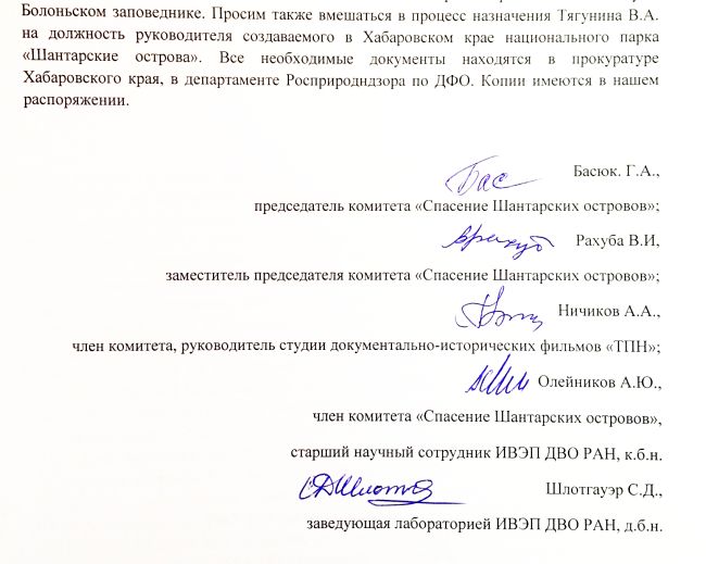 Кстати, под обращением к Генпрокурору, кроме инициативной группы комитета «Спасение Шантарских островов», подпись поставили ученые: заведующая лабораторией экологии растительности Института водных и экологических проблем ДВО РАН, доктор биологических наук Светлана Шлотгауэр - автор книг о Шантарах, и научный сотрудник того же института, кандидат биологических наук Алексей Олейников - участник экспедиций на Шантарский острова.