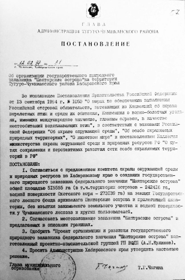 Письмом Госкомприроды Российской Федерации от 23.07.1990 г. за №02-16-789/1468 на имя Хабаровского краевого комитета по экологии и природным ресурсам уточняется Проект создания сети особо охраняемых природных территорий Российской Федерации на период до 2005 года, в составе которых для территории Хабаровского края указывается заповедник «Шантарский» площадью 300 тыс. гектаров. В дальнейшем на островах Шантарского архипелага органами исполнительной власти края планировалось создание заказника и, наконец, национального парка.