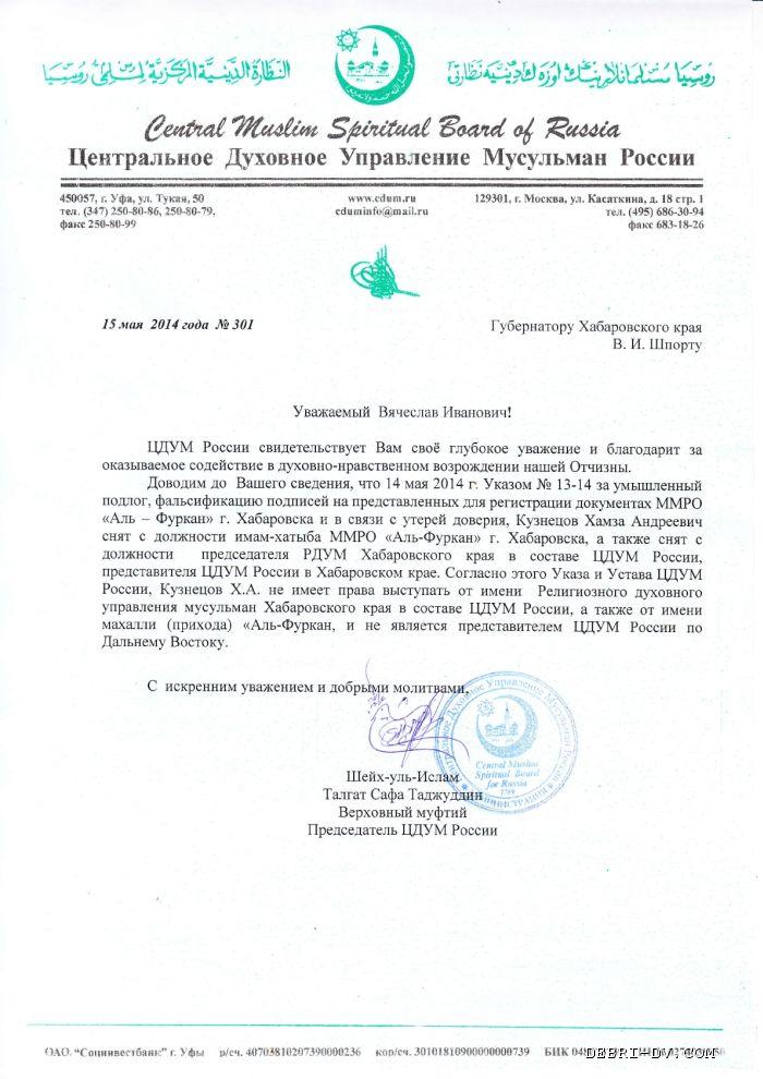В указе за №13-14 о снятии значится, что Хамза Кузнецов снят «за умышленный подлог, фальсификацию подписей на предоставленных в Управление Минюста России по Хабаровскому краю для регистрации документов мусульманской организации «Аль-Фуркан» Центрального духовного управления мусульман России, и в связи с утратой доверия».