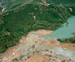 Основная селевая масса пошла по руслу Водопадного. В его устье был тридцатиметровый водопад, под теплыми массирующими струями которого резвилось не одно поколение гостей Долины. Оставив от водопада только воспоминание, сель врезался в русло Гейзерной и раздался в стороны. Похоронив под завалами три красивейших гейзера — Тройной, Сахарный и Сосед, — грязевой поток пошел дальше— вниз по Гейзерной. Его удар приняли на себя Нижние ворота — две живописные скалы, сжимавшие с боков русло реки. Здесь сель затормозил и создал плотину высотой от 10 до 40 метров и протяженностью несколько сотен метров. Уровень воды в Гейзерной стал быстро подниматься. Уже на следующий день образовалось теплое озеро, которое затопило гейзеры Конус, Большой и Малый и подобралось к Великану и Жемчужному. Под водой оказался и источник Малахитовый Грот — краса и гордость Долины, вода вплотную подошла к Большому Витражу — крутому склону реки, превращенному гейзерами, источниками и термофильными водорослями в нечто исключительное по выразительности и колориту. В эти дни казалось, что реализуется какой-то дьявольский сценарий по тотальному уничтожению Долины.