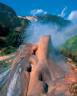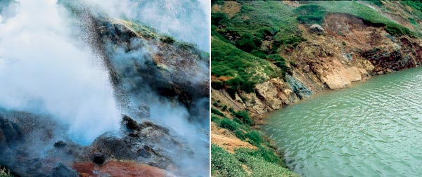 Кто видел, как из лопнувшей трубы бьет струя кипятка, тот без труда составит представление о гейзере. Чтобы вообразить грязевой котел, надо вспомнить, как кипит смола или варится густая каша. Потеки краски на холсте и палитре художника напомнят многоцветные переплетения термофильных водорослей вокруг источников. Вероятно, каждому кусочку Долины можно отыскать объяснение или подобие, но вся Долина — необъяснима и бесподобна.