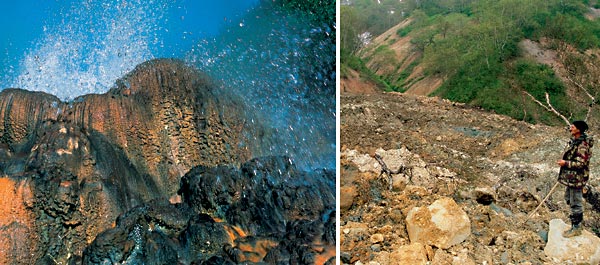 Один из самых красивых и больших щитов был у гейзера Сахарный. Источник оказался на пути селевого потока, и теперь его покрывает десятиметровый слой грязи и камней (снимок справа).