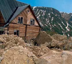 — День был очень хороший, солнечный, — вспоминает Валерий Цыпков. — Пришел вертолет с туристами. Ну, мы их встретили, и Володя Злотников повел их вниз, к гейзерам на экскурсию, а я остался готовить обед, потом вышел к крыльцу, сижу и курю. И пилоты тут рядом ходят и рассуждают: один говорит, пойти что ли в баньку попариться, а другой ему: у тебя и так спина болит, назад будешь подниматься — ветром еще прохватит. В общем, раздумал тот пилот идти в баньку. И вот, смотрю я: будто обвал пошел по хребтику, что на самом верху, с левой стороны, и беззвучно, как в немом кино. Видно было, что взметнулась грязь, пыль, и дальше начал сыпаться соседний борт, слева — направо, одна сопка за другой, как домино! Тут я крикнул: «Сель пошел!» Пилоты обернулись, тоже смотрят. Интересно ведь. Но когда этот борт весь-то рухнул и сопка, которая уже ближе к нам, тоже обрушилась, я вскочил. Тут и грохот раздался и земля содрогнулась. Все на грохот из домов повыскакивали, а я смотрю, как сель заполняет ущелье, и думаю: ничего, мол, не заполнит, там ведь глубина метров сто... Второй пилот метнулся к вертолету, а командир кричит ему: «Не успеем взлететь! Уходим в сопку!» И вот, когда уже вал был метрах в двадцати—тридцати, мы все рванули в сопку. На бегу я обернулся: вижу, зеленый вагончик дизельной электростанции впереди этого вала едет, тот его толкает перед собой, словно тачку, и — прямо на домик Саньки, смотрителя нашего! А в этом домике у него собака осталась, и вот он еще успел метнуться в домик, выскочил с этой собакой, отбросил ее в сторону и побежал за нами. Вагончик с ходу въехал в домик, и в этот момент все остановилось. Громадные глыбы застыли у самого порога гостиницы. Секунду вал постоял, потом как будто кто-то вздохнул, вал немного откатился и замер!