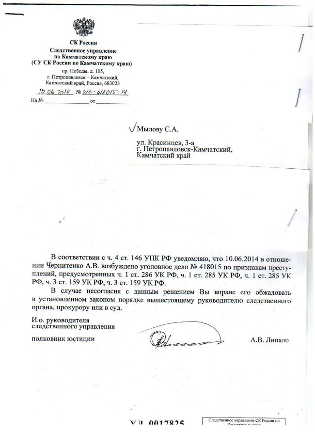 Причем дело возбуждено сразу по нескольким статьям: «Превышение должностных полномочий», «Злоупотребление должностными полномочиями» и даже «Мошенничество» (надо полагать, что открылись и другие неблаговидные поступки Чернитенко).