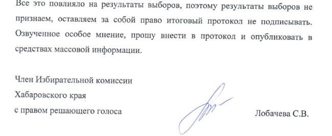 Все это повлияло на результаты выборов, поэтому результаты выборов не признаем, оставляем за собой право итоговый протокол не подписывать. Озвученное особое мнение, прошу внести в протокол и опубликовать в средствах массовой информации.