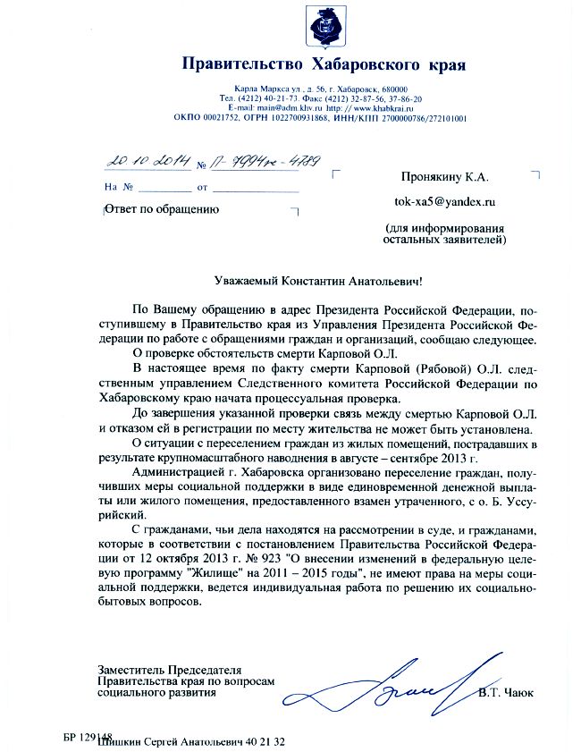 О ситуации с переселением граждан из жилых помещений, пострадавших в результате крупномасштабного наводнения в августе - сентябре 2013 г.
