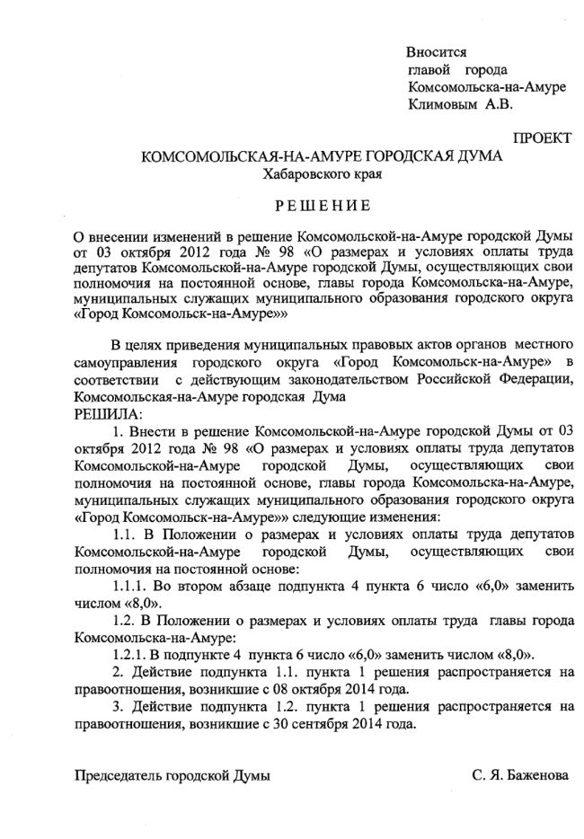 На рассмотрение депутатам гордумы Комсомольска-на-Амуре поступил проект решения, внесенный главой города Андреем Климовым об увеличении себе ежемесячных премий за выполнение особо важных и сложных заданий с 6 до 8 должностных окладов. Столько же - председателю гордумы Светлане Баженовой, и депутатам, работающим на постоянной основе.