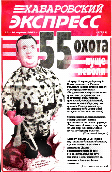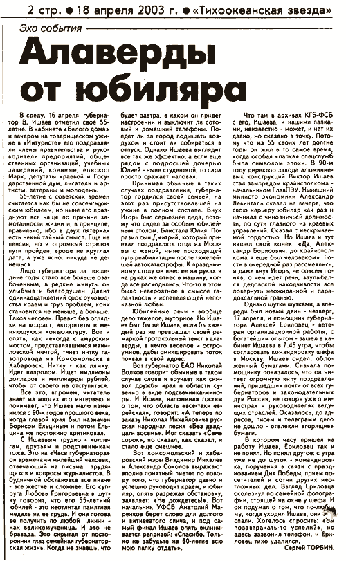 В среду, 16 апреля, губернатор В. Ишаев отметил свое 55-летие. В кабинете «Белого дома» и вечером на товарищеском ужи не в «Интуристе», его поздравляли члены правительства и руководители предприятий, общественных организаций, учебных заведений, военные, епископ Марк, депутаты краевой и Государственной дум, писатели и артисты, ветераны и молодежь.