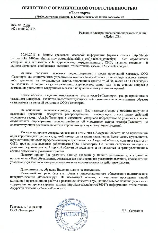 На основании вышеизложенного, прошу Вас незамедлительно с момента получения настоящей претензии прекратить распространение информации относительно действий учредителя газеты «Альфа-Телепорт» в указанном материале посредством её удаления, а также опубликовать опровержение распространённых об учредителе газеты «Альфа-Телепорт» не соответствующих действительности и порочащих деловую репутацию сведений.