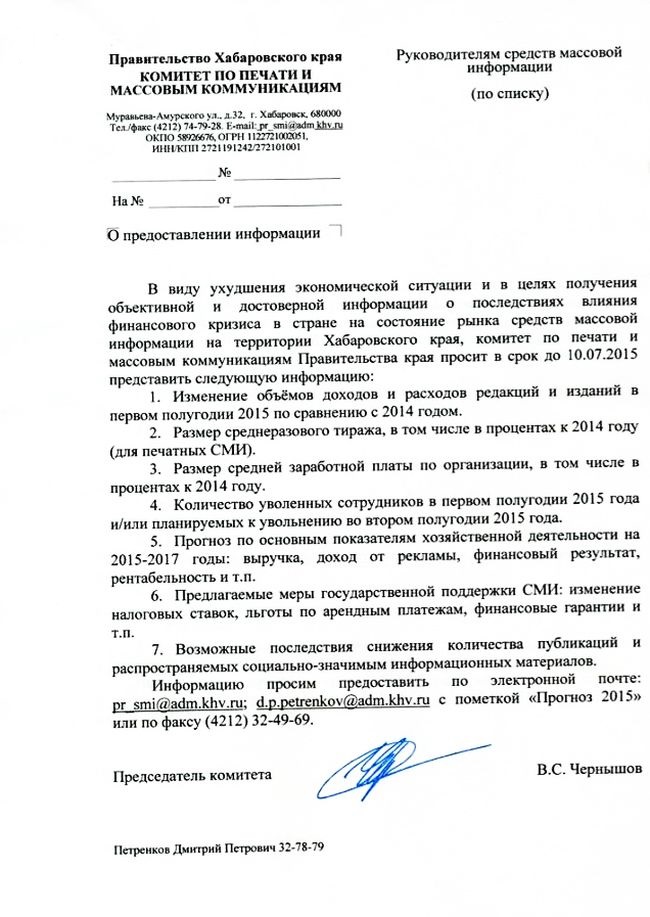 «В виду ухудшения экономической ситуации и в целях получения объективной и достоверной информации о последствиях влияния финансового кризиса в стране на состояние рынка средств массовой информации на территории Хабаровского края, комитет по печати и массовым коммуникациям правительства края просит в срок до 10 июля с.г. сообщить предлагаемые меры государственной поддержки СМИ: изменение налоговых ставок, льготы по арендным платежам, финансовые гарантии и т.п.» - так значится в письме за подписью г-на  Чернышова.