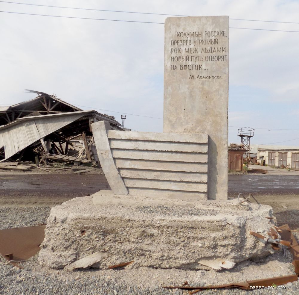 | Демонтированный памятник теперь стоит на заднем дворе порта в Охотске |