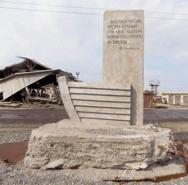 Памятник получился в виде символической речной ладьи с парусом-стеной скрижали под 2,5 метра, на ней выбиты имена участников героического похода. А в сторону к морю начертаны слова государева мужа Михаила Ломоносова: «Колумбы росские, презрев угрюмый рок, меж льдами новый путь отворят на восток».