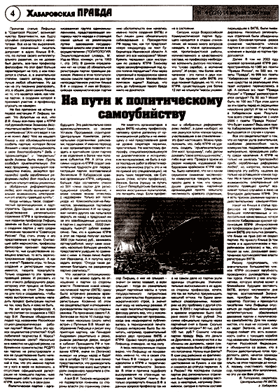 Далее. В том же 2003 году краевой организацией КПРФ распространялось по 1380 экз. газеты “Правда России”, по 500 экз. га зеты “Правда”, по 999 экз. газеты “Хабаровской правда”. И денежные средства за реализацию этих газет исправно перечислялись в ЦК. А сколько экз. газет “Правда России” и “Правда” распространяется сегодня? По 50 экз.? Может быть по 100 экз.? При этом долги за эти газеты перед их редакциями неуклонно растут. И так не только в Хабаровском крае. Результатом всего станет закрытие с июля 2006 г. газеты “Правда России”. Что будет взамен? Ведь своя газета Хабаровским крайкомом КПРФ выпускается от случая к случаю.