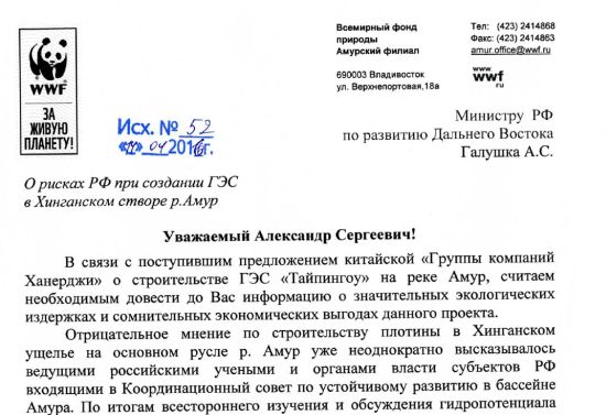 В WWF пришли к мнению: группа компаний «Ханерджи» не представляется надежным партнером для любых инвестиционных проектов. Подтверждает это мнение и то, что письмо главе Минвостокразвития подписано вице-президентом одной из дочерних компаний «Ханерджи» Цзи Дуном, названия которой, выгравированное на печати, найти среди упоминаний в сети Интернет не удалось.