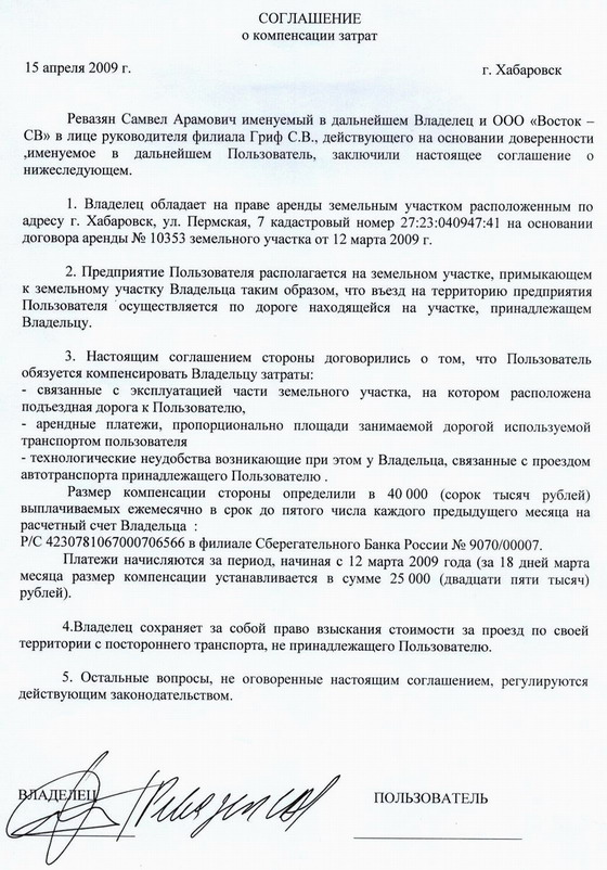 Как рассказал директор головного офиса «Восток-УАЗ» во Владивостоке Сергей Гриф, соседний земельный участок (кадастровый № 27:23:040947:41) был передан на правах арены на аукционе господину Ревазяну в марте сего года. Однако, этот участок был сформирован без учета прав смежных землепользователей — соседей — фирмы «Восток-УАЗ». В результате он был начерчен с включением в его состав дороги, по которой осуществлялся единственный проезд и проход на автопредприятие.
