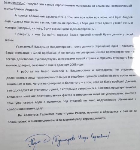 | Оригинал письма главе государства арестованного градоначальника с подписью. С аккуаунта Игоря Пушкарева в Фэйсбуке. |
