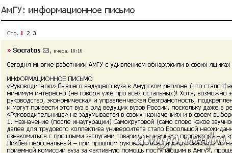 На форуме сайта информационного агентства «Амур.инфо» накануне появилась новая тема, в первом сообщении которой анонимный пользователь с резкой критикой обрушивается на нынешнее руководство Амурского государственного университета, а именно на ректора университета – Елену Астапову.