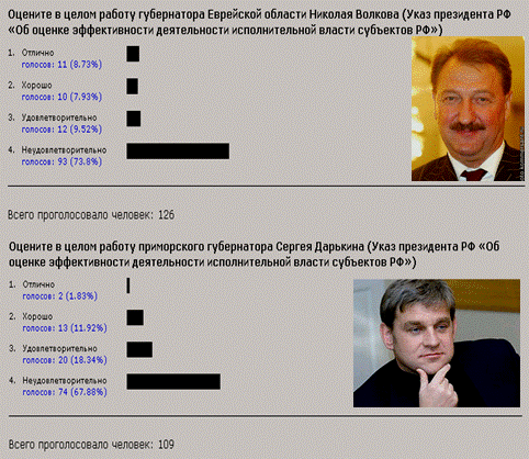 - Губернатор Еврейской автономной области Николай Волков (на должности с 1991 г.) – 73.8 % читателей «Дебри-ДВ» оценивает его деятельность «неудовлетворительно».