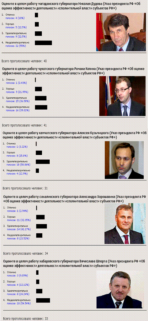 - Губернатор Сахалина Александр Хорошавин (на должности с 2007 г.) – 41.17 % читателей «Дебри-ДВ» оценивает его деятельность «удовлетворительно».