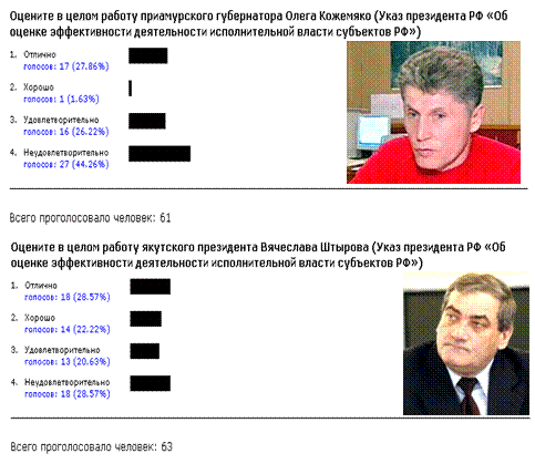 Должны сразу констатировать что, «отличников» среди губернаторов нет. Больше всех положительного рейтинга набрал президент Республики Саха (Якутия) Вячеслав Штыров, его деятельность оценили на «отлично» 28.57 % пользователей, но столько же и «неудовлетворительно». Это «золотое равновесие» в работе, позволило Штырову выйти в первом полугодии 2009 года в лидеры среди действующих губернаторов. Лидер по антиголосованию – губернатор ЕАО Николай Волков, его деятельность оценили «неудовлетворительно» - 73.8 % респондентов.