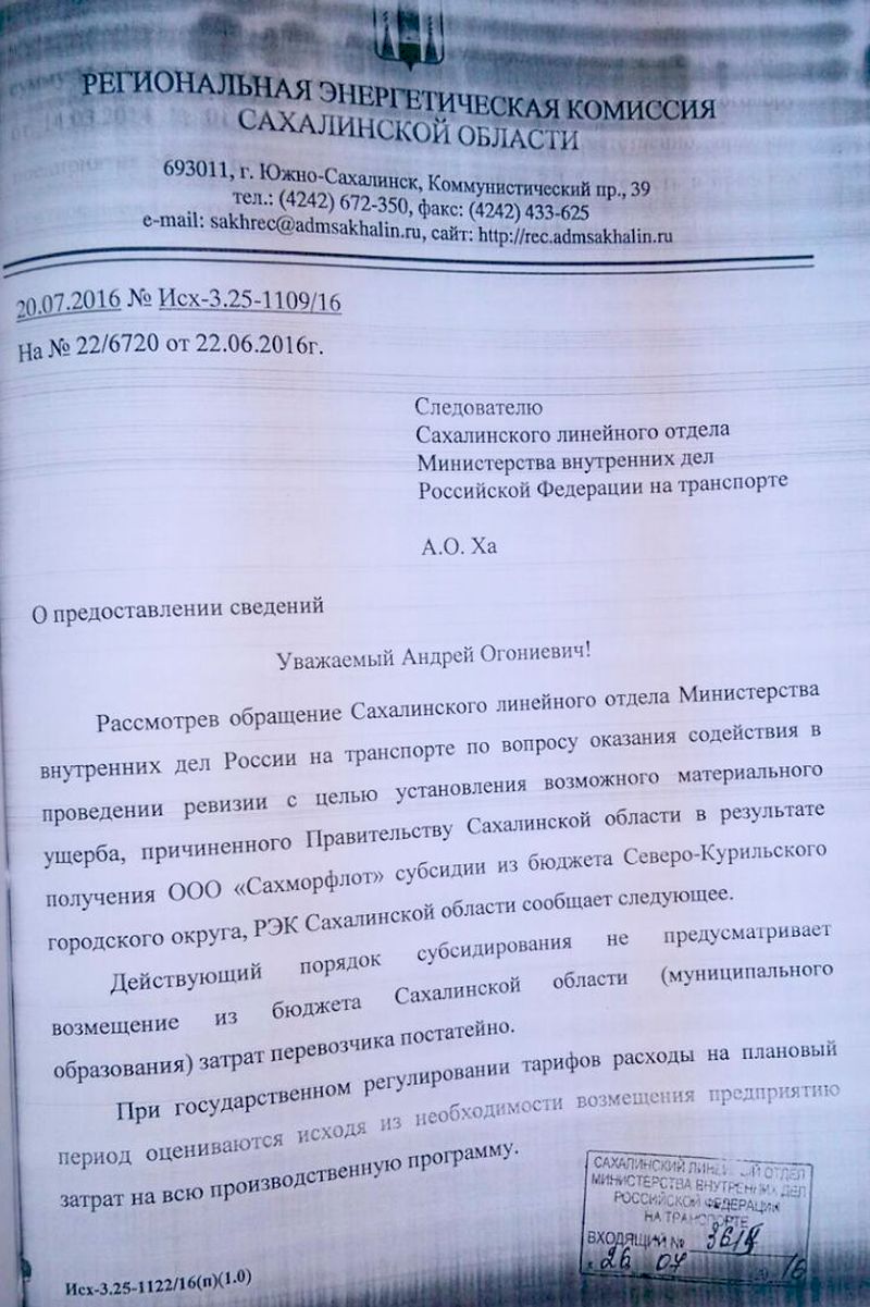 В ответе следователю Сахалинского линейного отдела МВД РФ на транспорте Ха А.О. за № исх-3.25-1109/16 от 20 июля 2016 г. на №22/6720 от 22 июня 2016 г. РЭК Сахалинской области ответил (разъяснил) - это имеется в материалах уголовного дела №802068 (см. копию ниже):